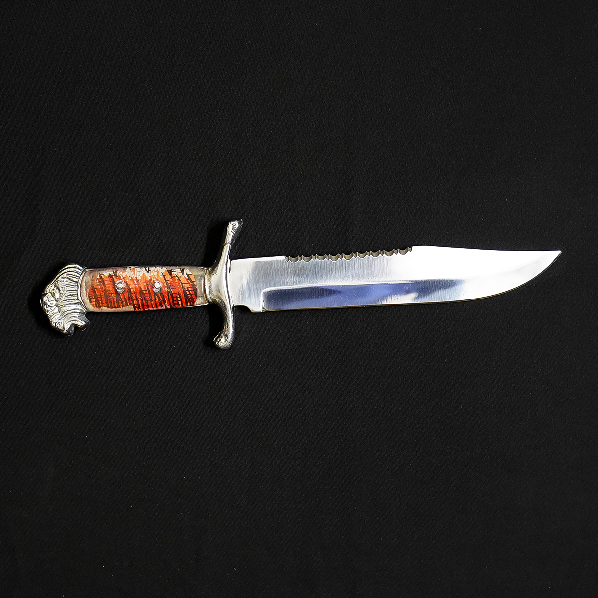 Vibrant Hybrid Handle: Polished dark scales accented with colorful, multi-tonal mosaic inlays and brass pins.