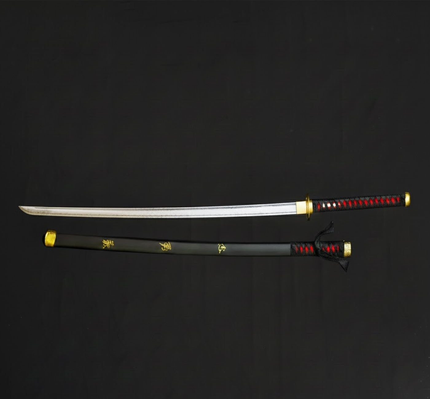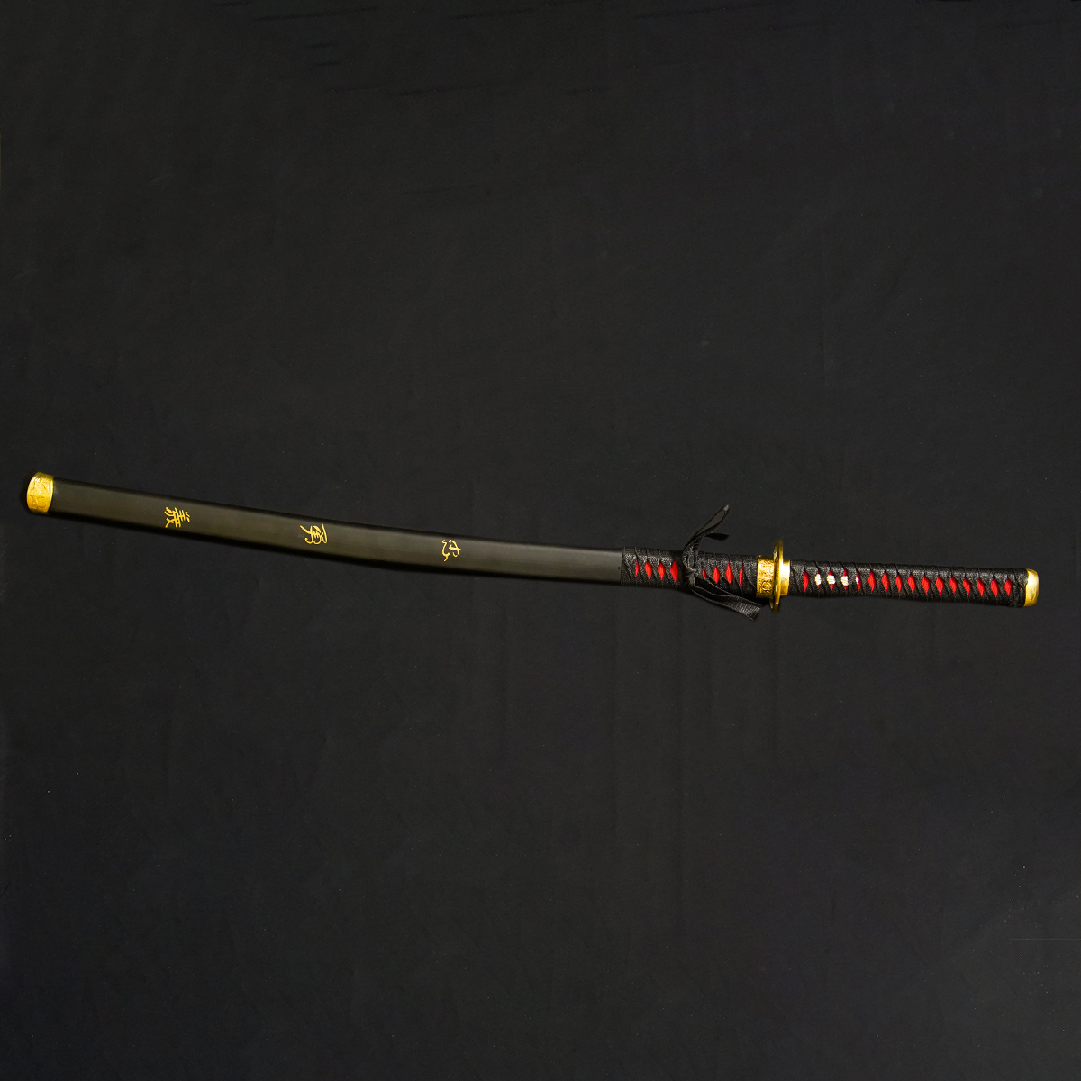 Striking Grip: The handle (tsuka) is wrapped in black cord with bold crimson (red) diamond accents underneath, offering high contrast and a dynamic look.