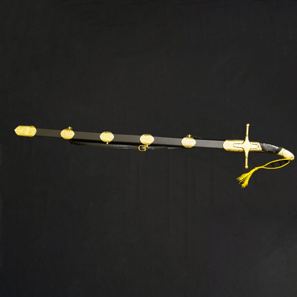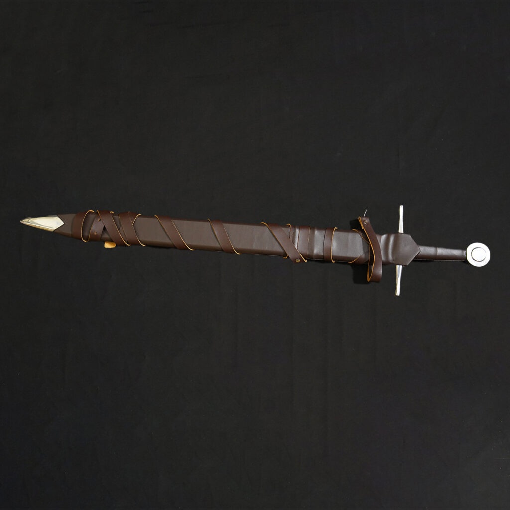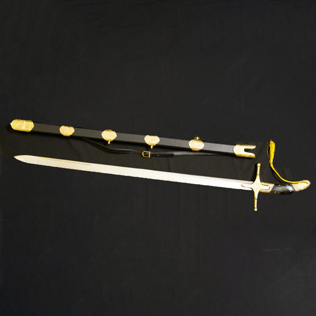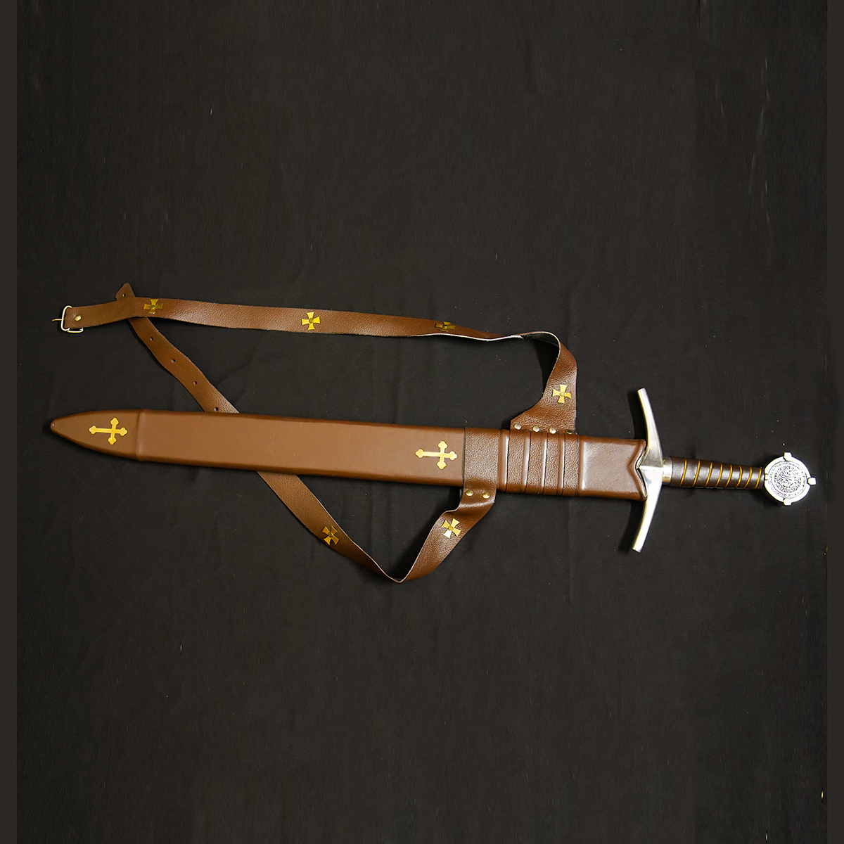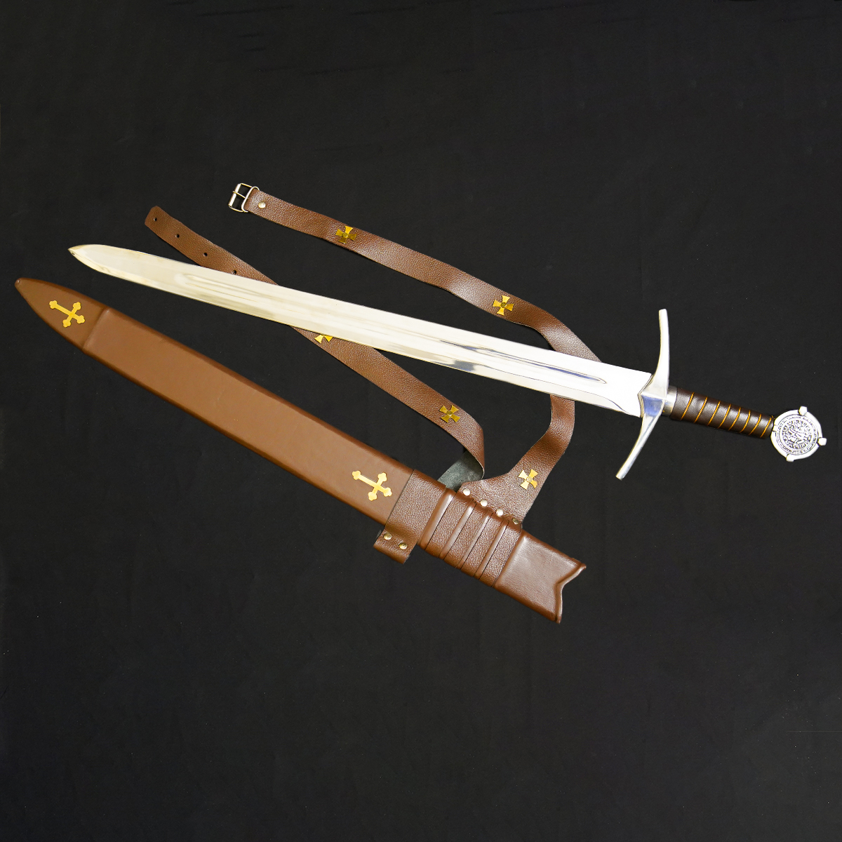 • Templar Cross Accents: The scabbard and leather harness are decorated with prominent gold cross emblems, strongly suggesting a connection to Crusader or Templar themes.