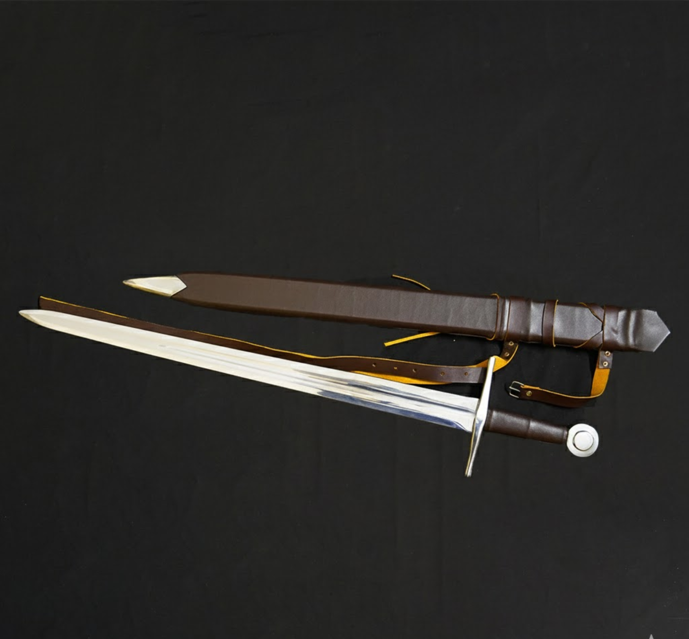 • Brown Leather Scabbard & Harness: Comes complete with a rich brown leather scabbard for protection and a matching carrying harness with buckle.