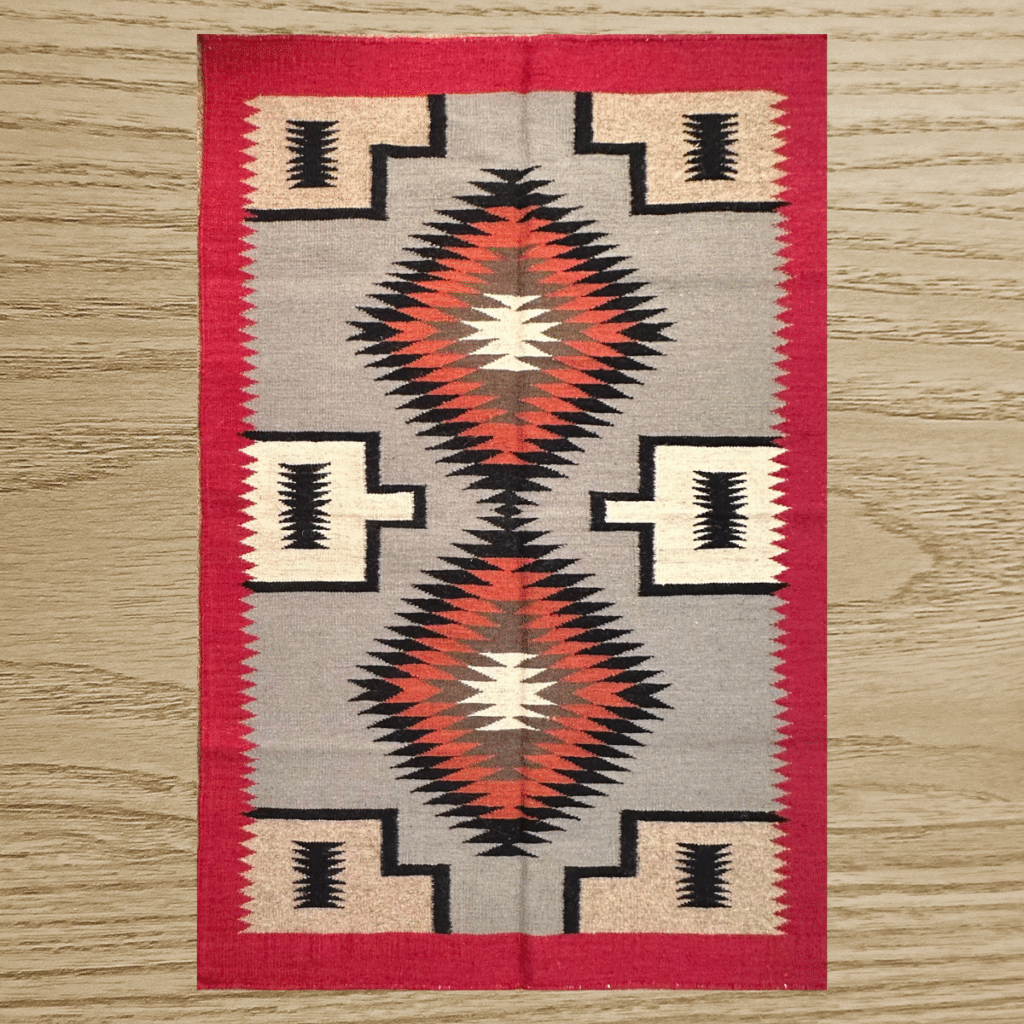 Central Feature: A striking, multi-color Navajo-style diamond/star motif (in orange, black, and blue).