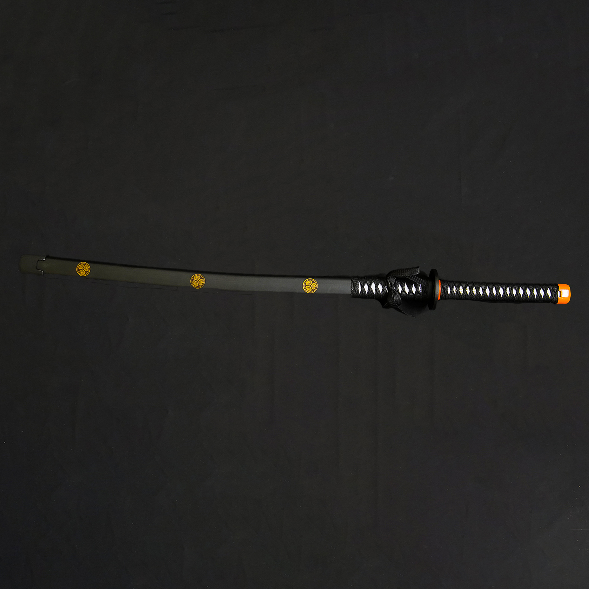 Contrasting Grip: The handle (tsuka) is wrapped in a classic black diamond pattern with white/silver accents and is capped with a bright orange/gold pommel.
