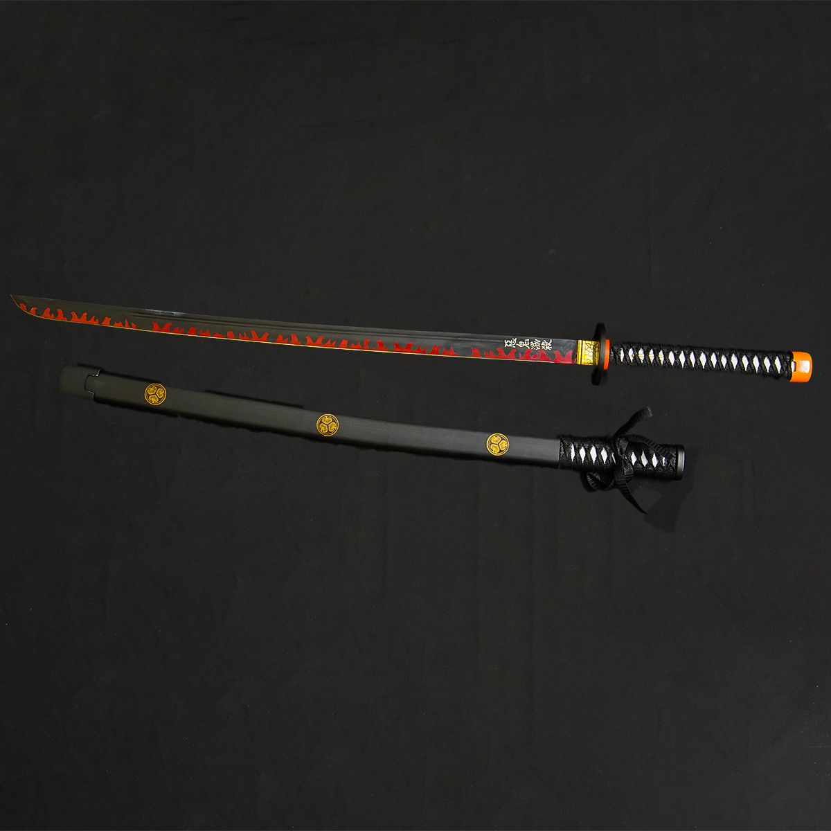 Symbolic Scabbard (Saya): The black scabbard is decorated with traditional gold Mon (crest/symbol) medallions, adding a touch of historical detail.