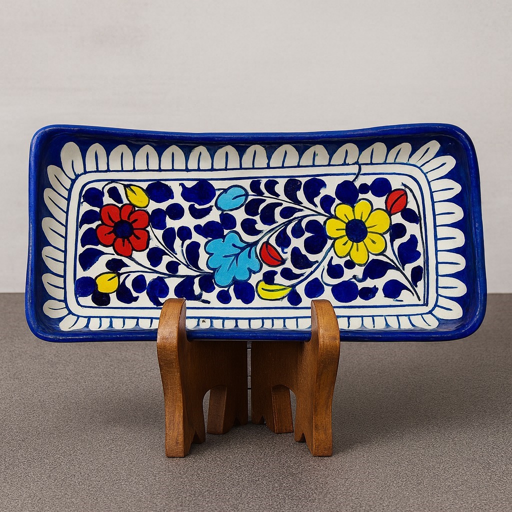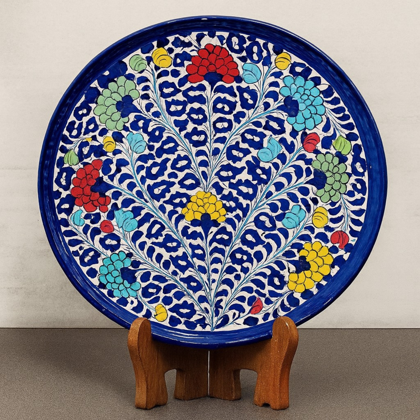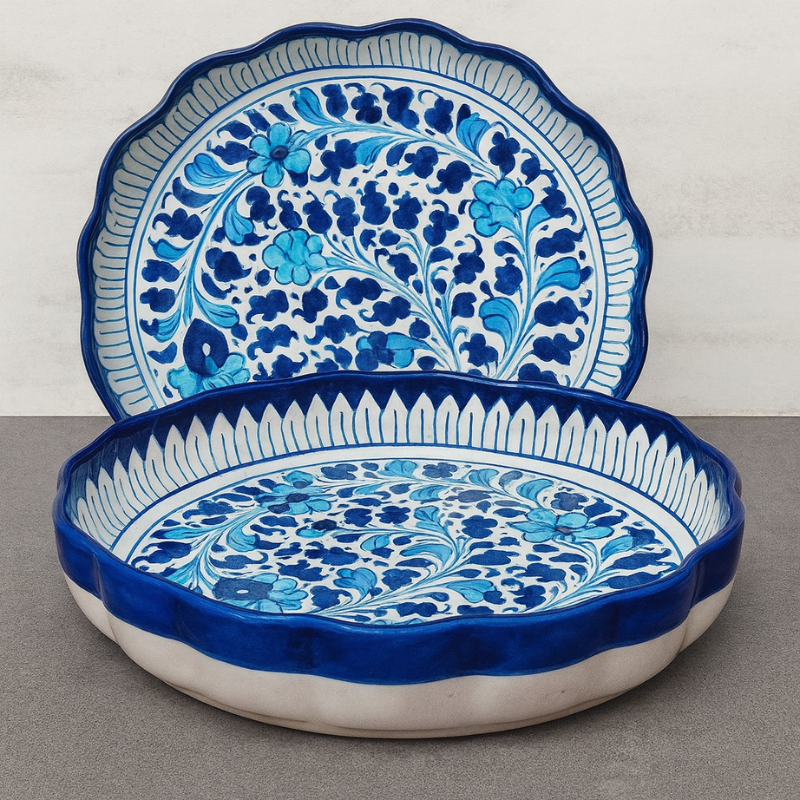 The richly colored glazed piece is hand made by our professional artisans of Multan. It features ocean blue under tone and abstract pattern in round shape that gives it an artisan-made professional look. This big platter can be used for presenting rice, BBQ, salads, and noodles