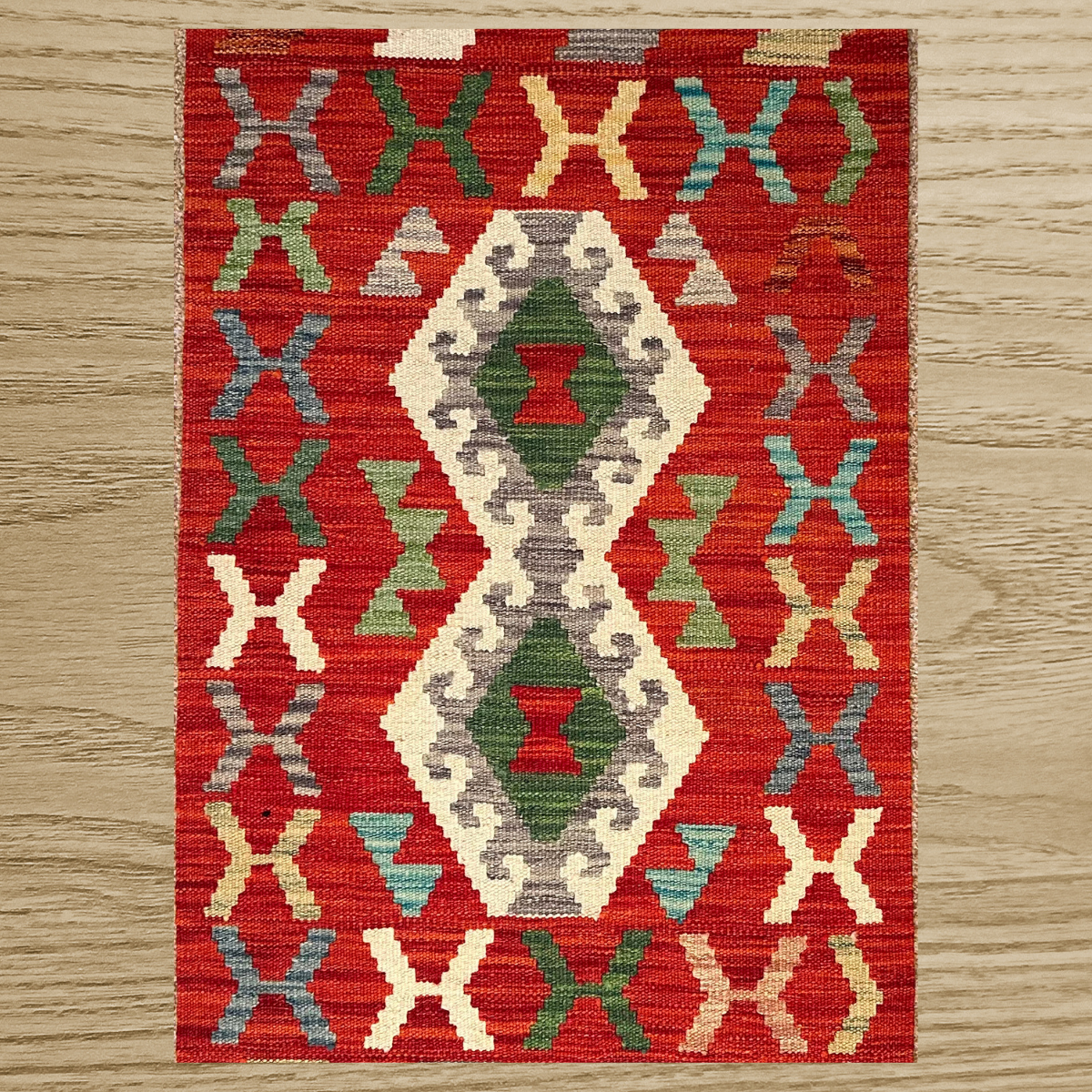 • Central Feature: A striking, multi-color Navajo-style diamond/star motif (in orange, black, and blue).
