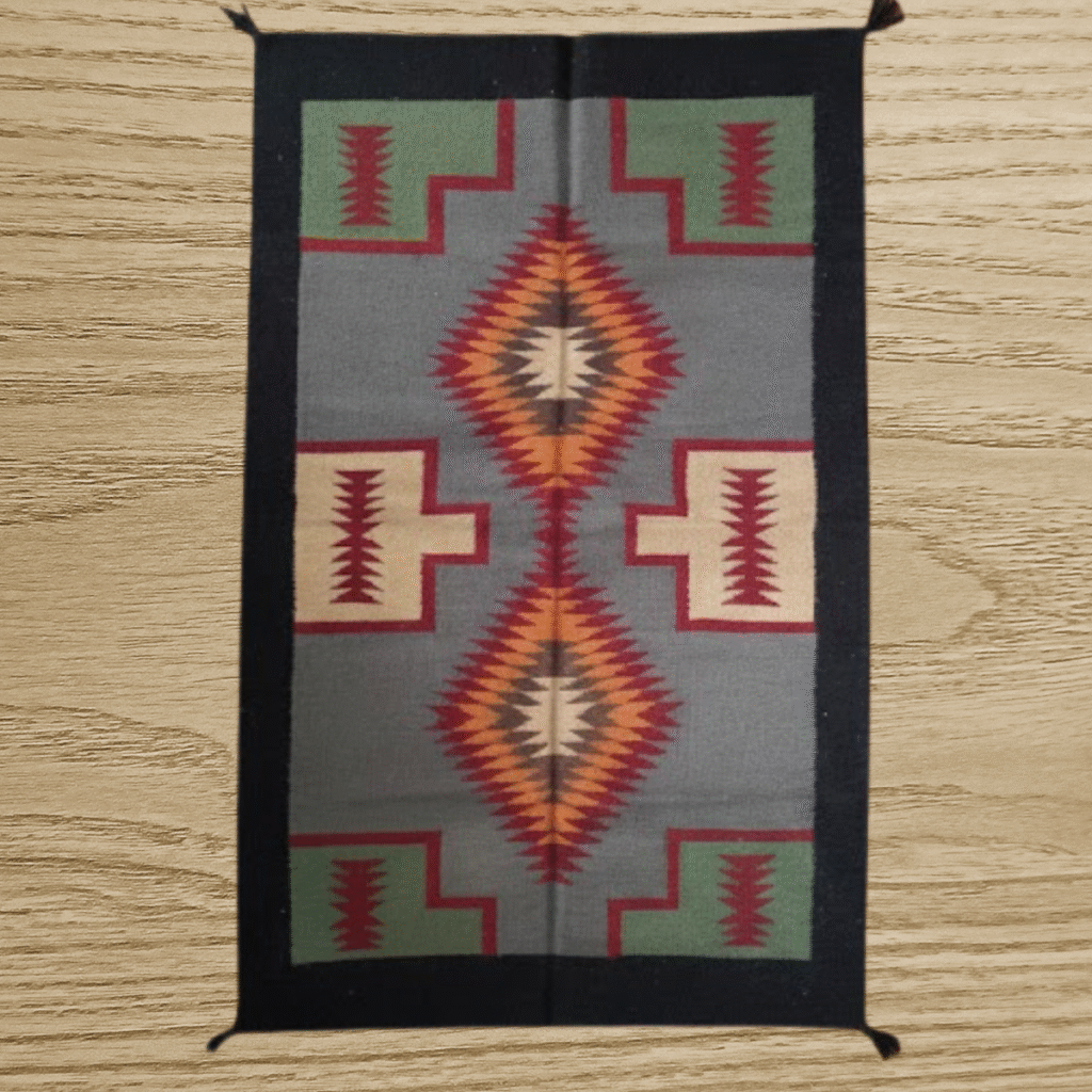 • Central Feature: A striking, multi-color Navajo-style diamond/star motif (in orange, black, and blue).