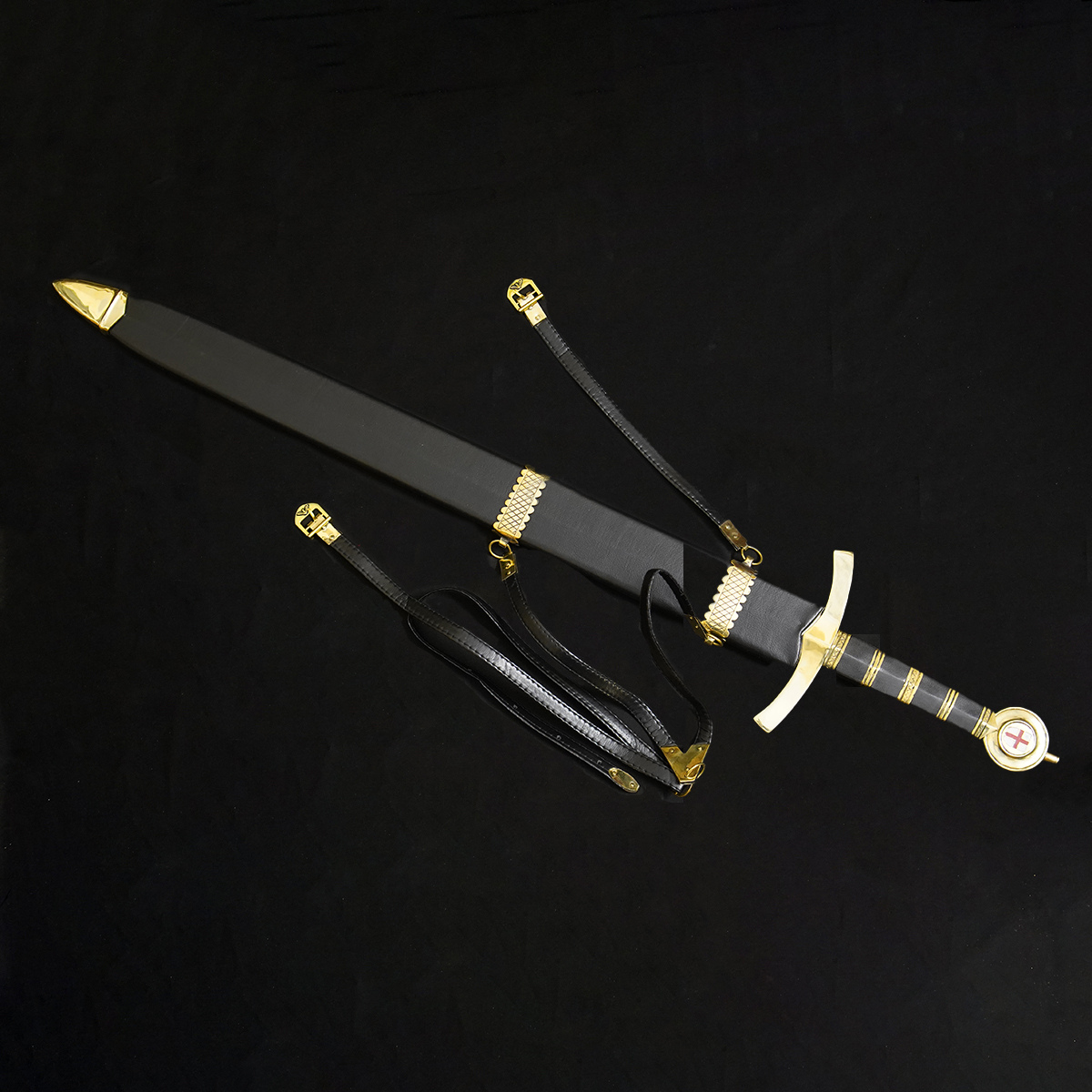 • Integrated Harness/Belt: The scabbard is fitted with a matching brown leather carrying strap/belt, making it ready for display or costuming.