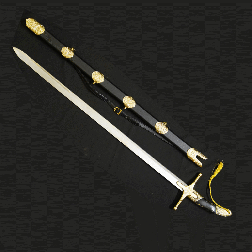 • Rich Leather Scabbard: Comes with a deep brown leather-wrapped scabbard accented with a polished metal chape (tip).