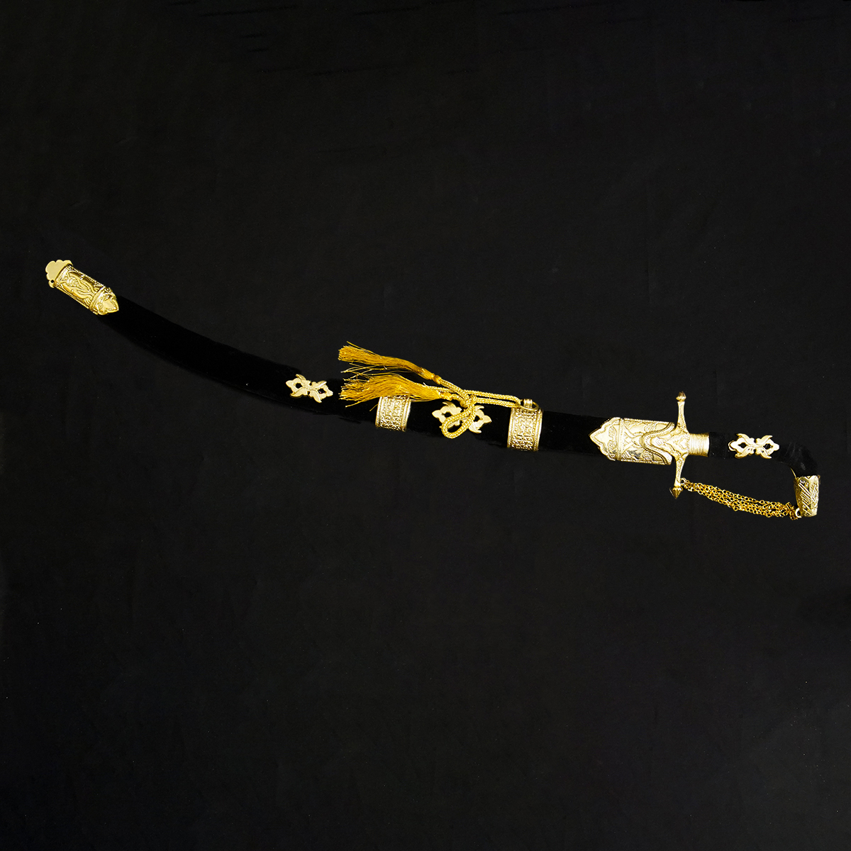 Scabbard Design: A wood-core scabbard wrapped in chocolate-brown leather, featuring an integrated “suspension bridge” for belt attachment.