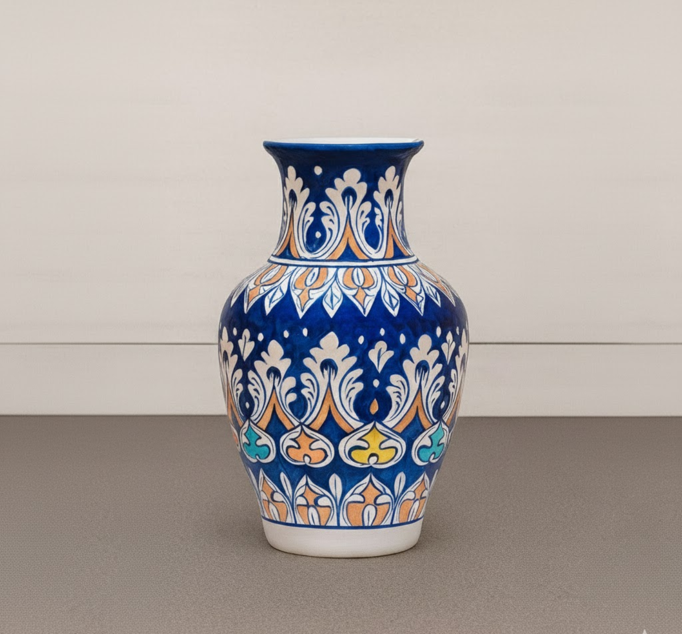 This striking hand-crafted ceramic vase, shaped uniquely and featuring a mesmerizing abstract-meets-intricate pattern, is a true statement piece. The deep ocean-blue undertones capture the essence of the sea, making it a beautiful focal point. Painstakingly created by skilled artisans in Multan, it’s the perfect size to elevate your desk or console with a touch of unique artistry.